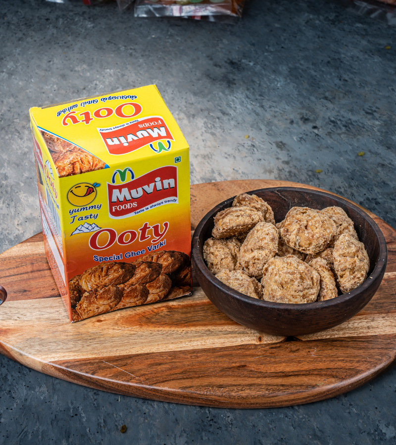 Prepared using authentic bakery-style recipes from Ooty, Ghee Varkey delivers a perfect balance of crunch and softness, along with a delightful savory flavor. Its layered texture and rich taste make it a favorite among tea-time snack lovers.